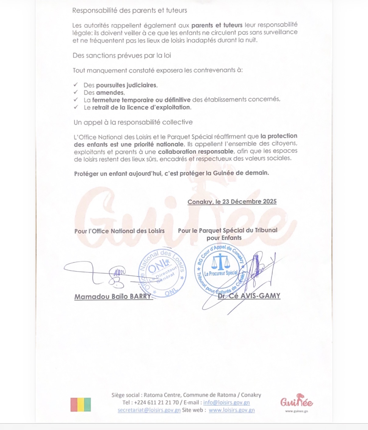 Dans un communiqué conjoint, l’Office national des loisirs et le parquet spécial du tribunal pour enfants informent l’opinion publique notamment le monde du secteur des loisirs du renforcement des mesures de protection des mineurs dans les lieux de loisirs conformément aux dispositions du code de l’enfant.