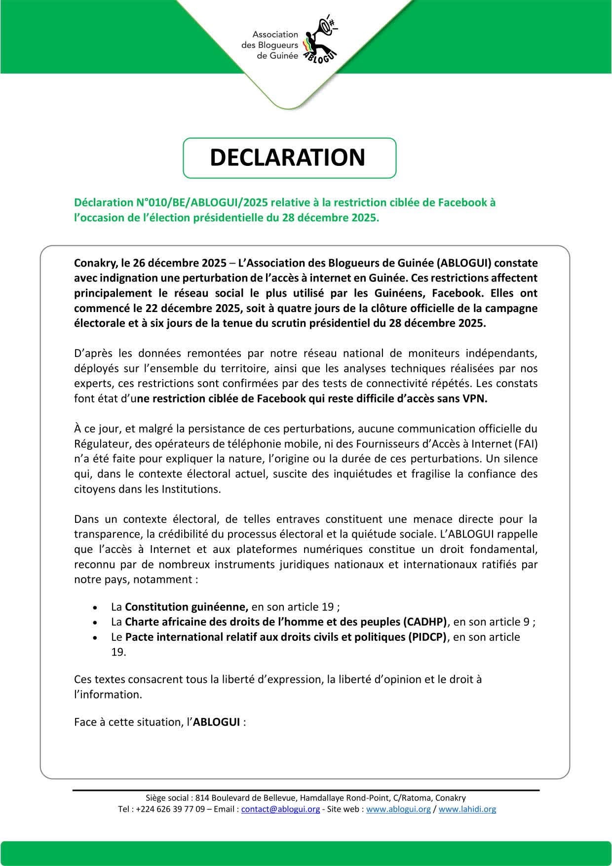 « L’ABLOGUI constate et dénonce des perturbations de l’accès à Internet, notamment une restriction ciblée de Facebook en Guinée depuis le 22 décembre 2025, à l’approche de l’élection présidentielle. En l’absence de communication officielle, nous exprimons nos vives préoccupations quant au respect du droit à l’information et des libertés fondamentales ». C’est le crie de cœur exprimé ce vendredi 26 décembre, par l’Association des blogueurs de Guinée, dans une déclaration qu’elle vient de publier.