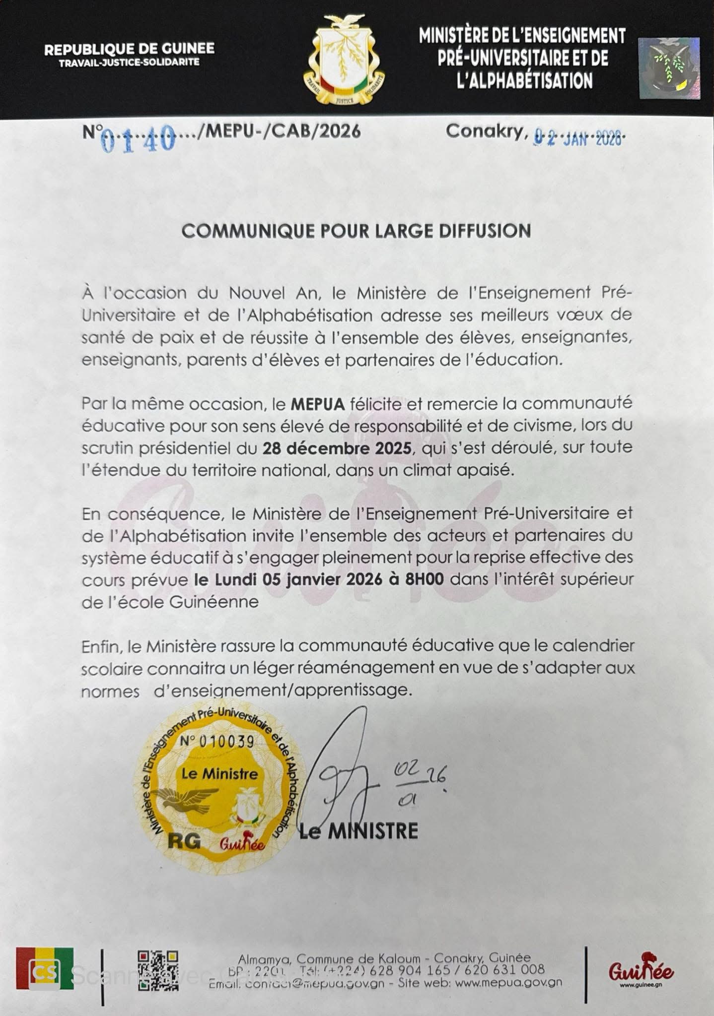 Dans un communiqué qu’il a diffusé vendredi soir, 02 janvier 2026, portant sur la fin des périodes de congé 2025 et de la reprise normal des cours, le Ministre de l’enseignement pré-universitaire et de l’alphabétisation (MEPU-A), annonce un léger réaménagement du programme éducatif.