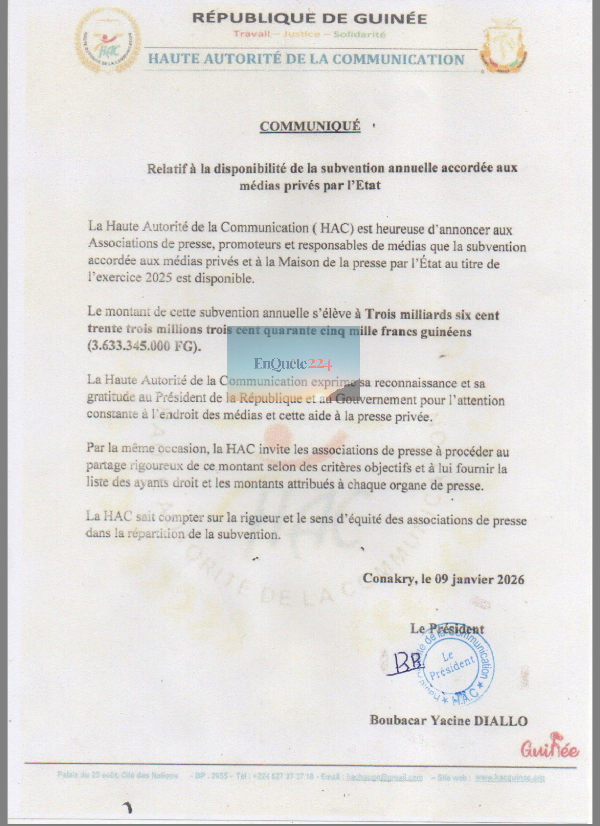 La Haute Autorité de la Communication (HAC) a annoncé, ce vendredi 9 janvier 2025, que la subvention annuelle destinée aux médias privés pour l’exercice 2025 est désormais disponible, via un communiqué officiel.