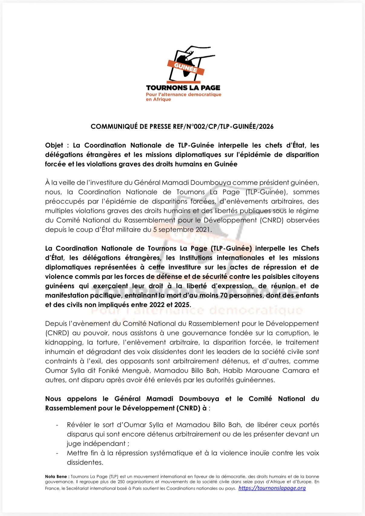 À la veille de l’investiture du Général Mamadi Doumbouya comme président guinéen, nous, la Coordination Nationale de Tournons La Page (TLP-Guinée), sommes préoccupés par l’épidémie de disparitions forcées, d’enlèvements arbitraires, des multiples violations graves des droits humains et des libertés publiques sous le régime du Comité National du Rassemblement pour le Développement (CNRD) observées depuis le coup d’État militaire du 5 septembre 2021.