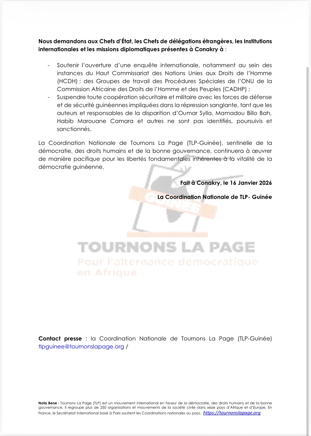 La Coordination Nationale de Tournons La Page (TLP-Guinée) interpelle les Chefs d’État, les délégations étrangères, les Institutions internationales et les missions diplomatiques représentées à cette investiture sur les actes de répression et de violence commis par les forces de défense et de sécurité contre les paisibles citoyens guinéens qui exerçaient leur droit à la liberté d’expression, de réunion et de manifestation pacifique, entraînant la mort d’au moins 70 personnes, dont des enfants et des civils non impliqués entre 2022 et 2025.