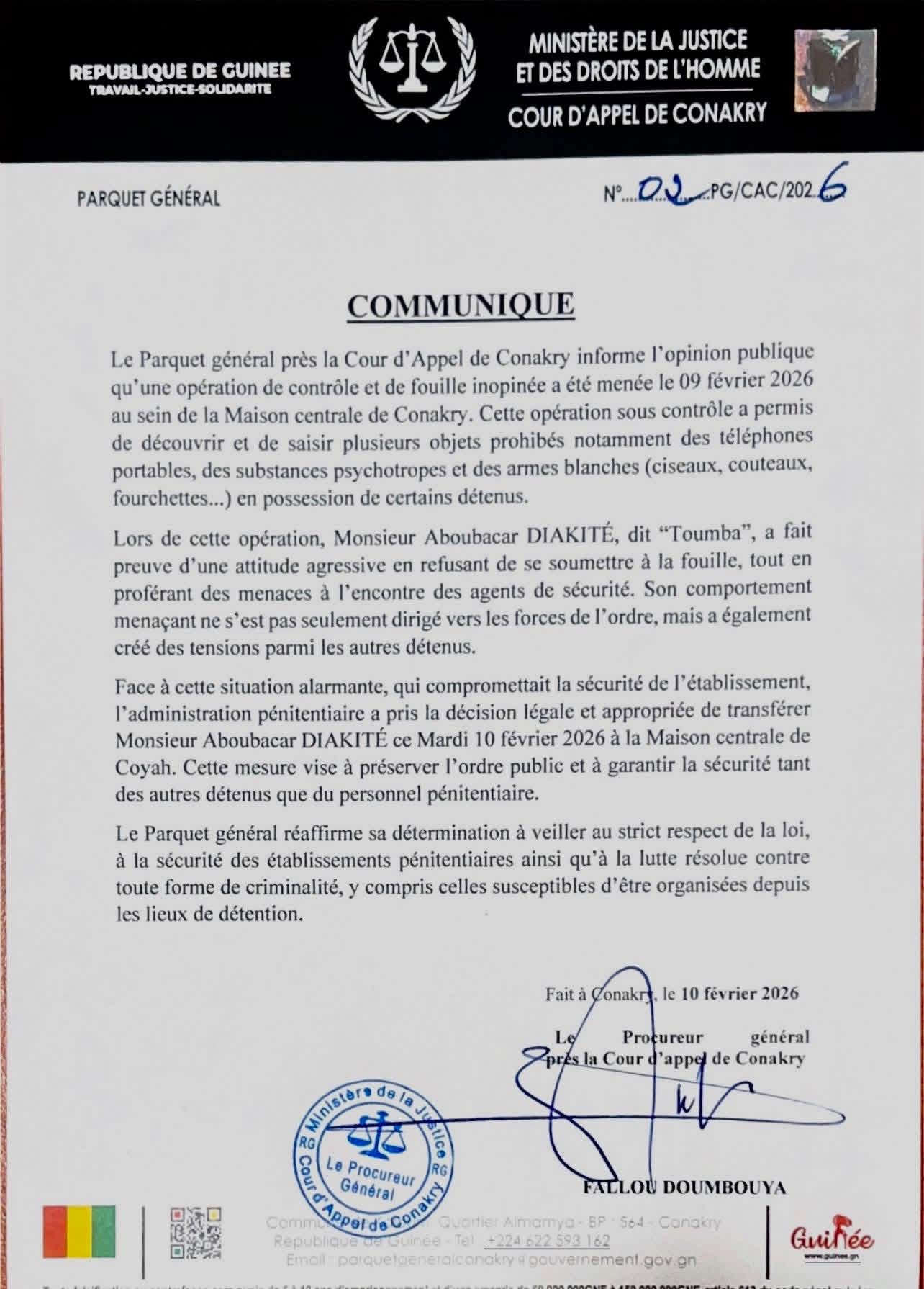 Aboubacar Sidiki Diakité, dit Toumba, a été transféré à la Maison d’arrêt de Coyah, selon un communiqué publié ce 10 février 2026 par le procureur général près la Cour d’Appel de Conakry, Falou Doumbouya. Le transfert a eu lieu lundi dernier, 9 février 2026.  Le procureur général justifie ce transfert par le refus du détenu de se soumettre à une fouille effectuée lundi dans l’enceinte de la maison centrale de Conakry par l’administration pénitentiaire.
