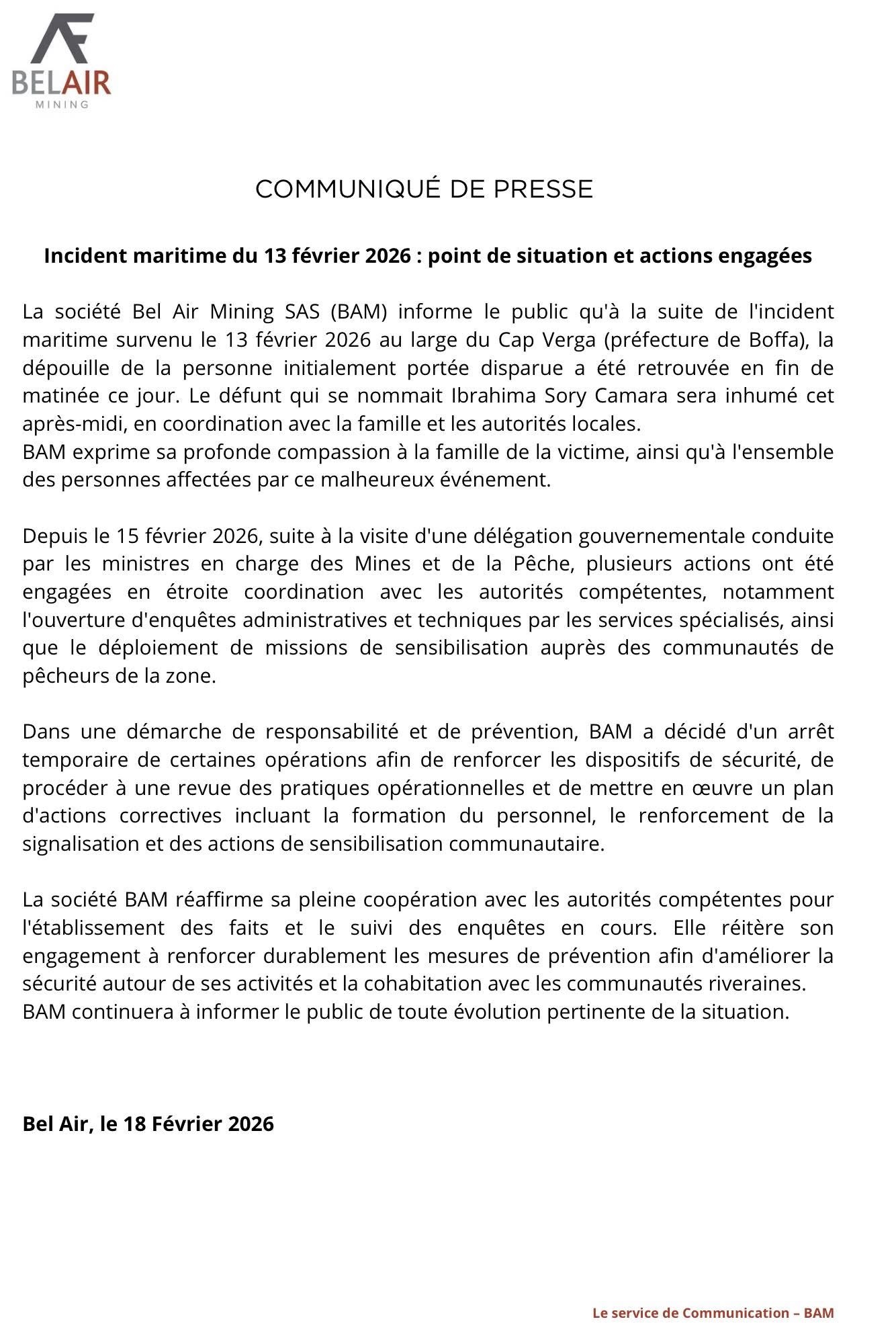 Le 13 février 2026, un grave accident maritime s’est produit au large du Cap Verga, dans la préfecture de Boffa.  Ibrahima Sory Camara, porté disparu suite à l’incident impliquant une barge de Bel Air Mining SAS et une pirogue de pêche artisanale, a été retrouvé mort.