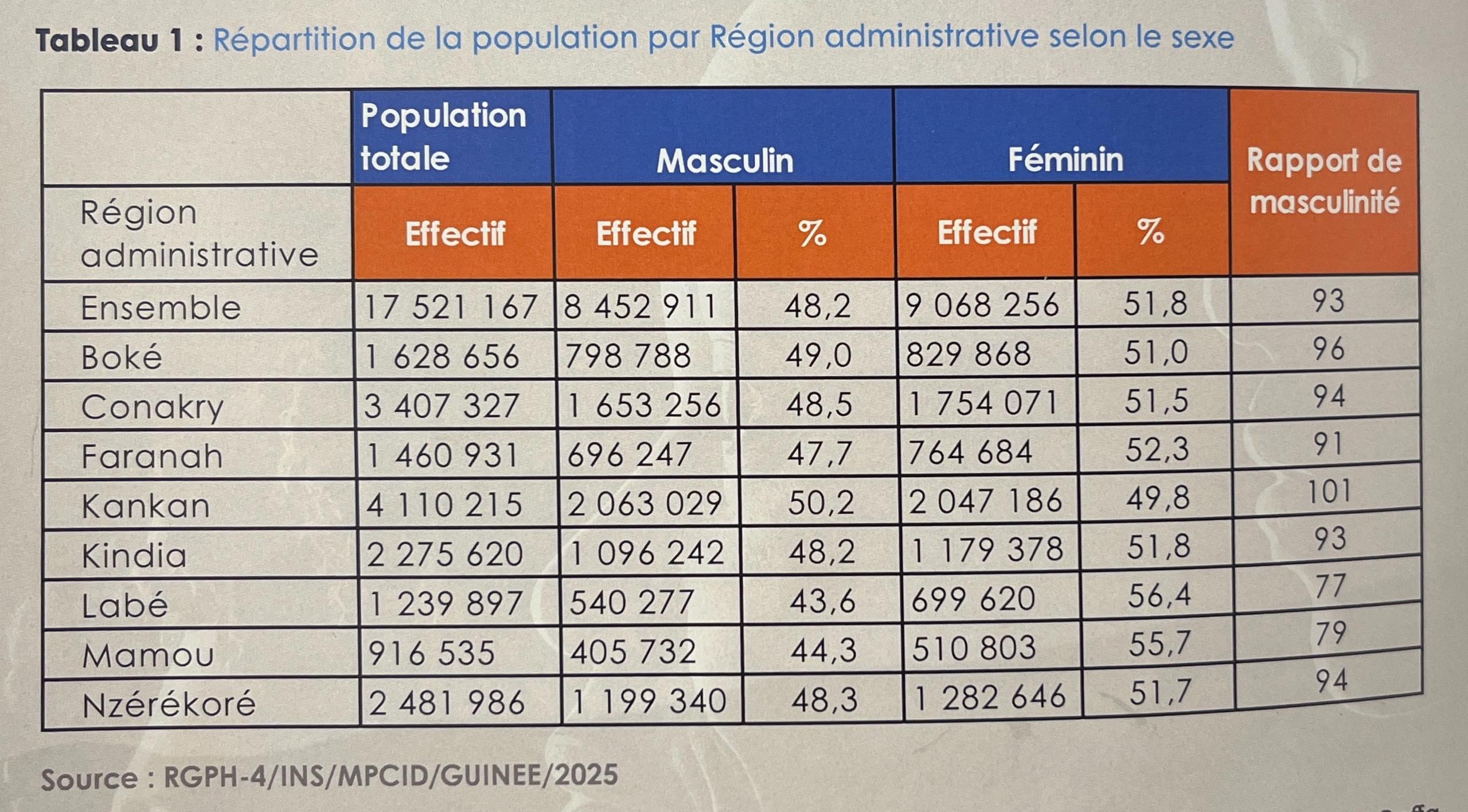 Le ministère du Plan et de la Coopération internationale a publié, mercredi 25 février, les résultats préliminaires du Recensement général de la population et de l’habitation (RGPH).  Selon ces données officielles, la population guinéenne résidente en 2025 est estimée à 17 521 167 habitants.