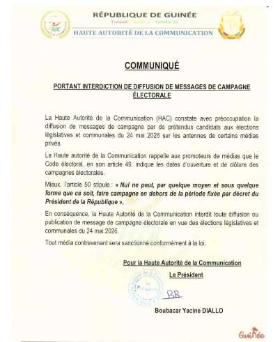 À trois mois des élections législatives et communales du 24 mai 2026, la Haute Autorité de la Communication (HAC) met en garde contre toute campagne électorale anticipée. Dans un communiqué signé par son président, Boubacar Yacine Diallo, l’institution interdit formellement la diffusion de messages de campagne avant l’ouverture légale fixée par décret. La HAC rappelle que les articles 49 et 50 du Code électoral interdisent toute propagande en dehors de la période autorisée. Elle précise que les médias contrevenants s’exposeront à des sanctions conformément à la loi.