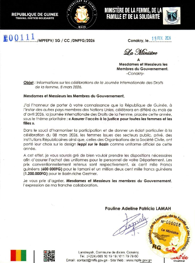 La Guinée a décidé de reporter la célébration de la Journée internationale des droits des femmes, habituellement fixée au 8 mars, à avril 2026. Cette décision, prise par le ministère de la Femme, de la Famille et des Solidarités, vise à harmoniser les initiatives et à donner une dimension particulière à l’événement, placé cette année sous le thème « Assurer l’accès à la justice pour toutes les femmes et les filles ». La ministre Pauline Adeline Patricia Lamah a annoncé dans un communiqué que l’uniforme officiel serait le design « leppi sur bazin ». Les prix ont été fixés à 600 000 francs guinéens pour le tamani et 1 200 000 francs guinéens pour le bazin riche Getzner.