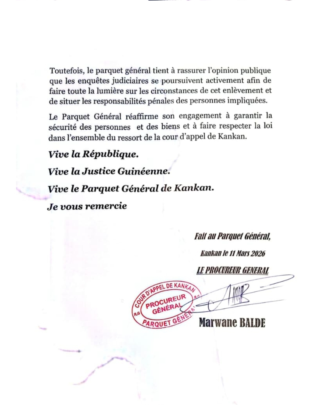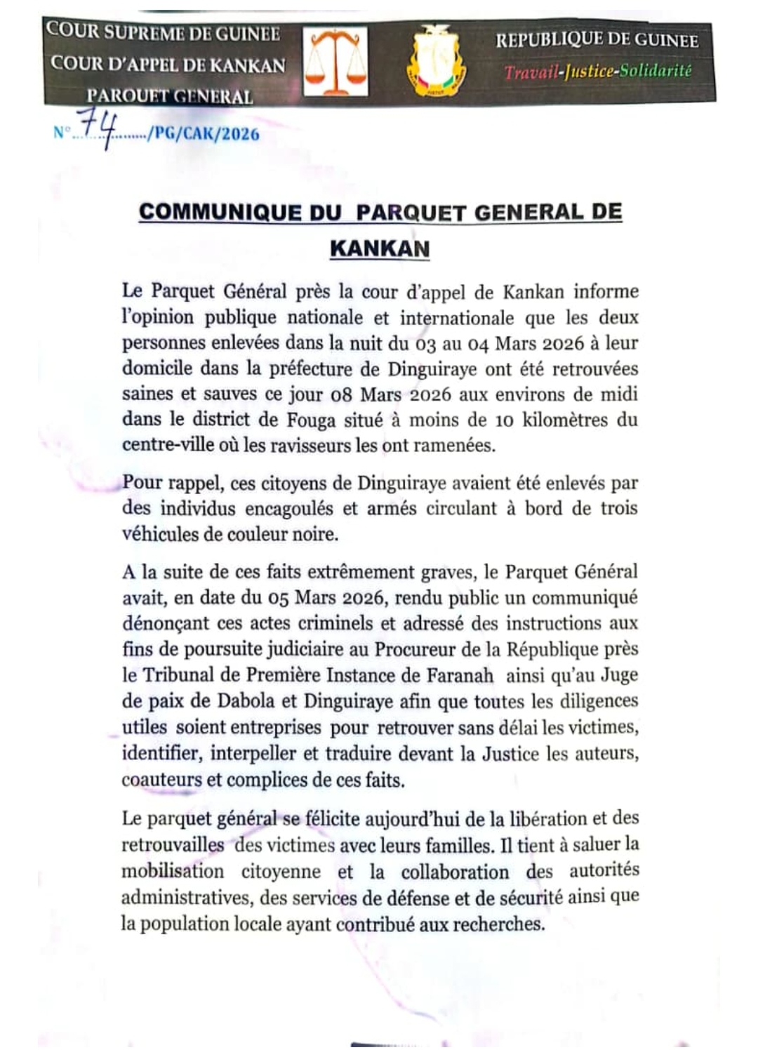 Le parquet général de Kankan a annoncé la poursuite des investigations concernant l’enlèvement des proches de l’ancien ministre Tibou Kamara, malgré leur libération.  Enlevés dans la nuit du 3 au 4 mars 2026 à Dinguiraye, les membres de la famille ont été retrouvés en début de semaine. Dans un communiqué publié ce mercredi 11 mars 2026, le procureur général près la Cour d’Appel de Kankan, Marwane Baldé, s’est félicité de leur libération. Il a toutefois précisé que l’enquête ouverte se poursuivrait afin de faire toute la lumière sur cet enlèvement et de déterminer les responsabilités.
