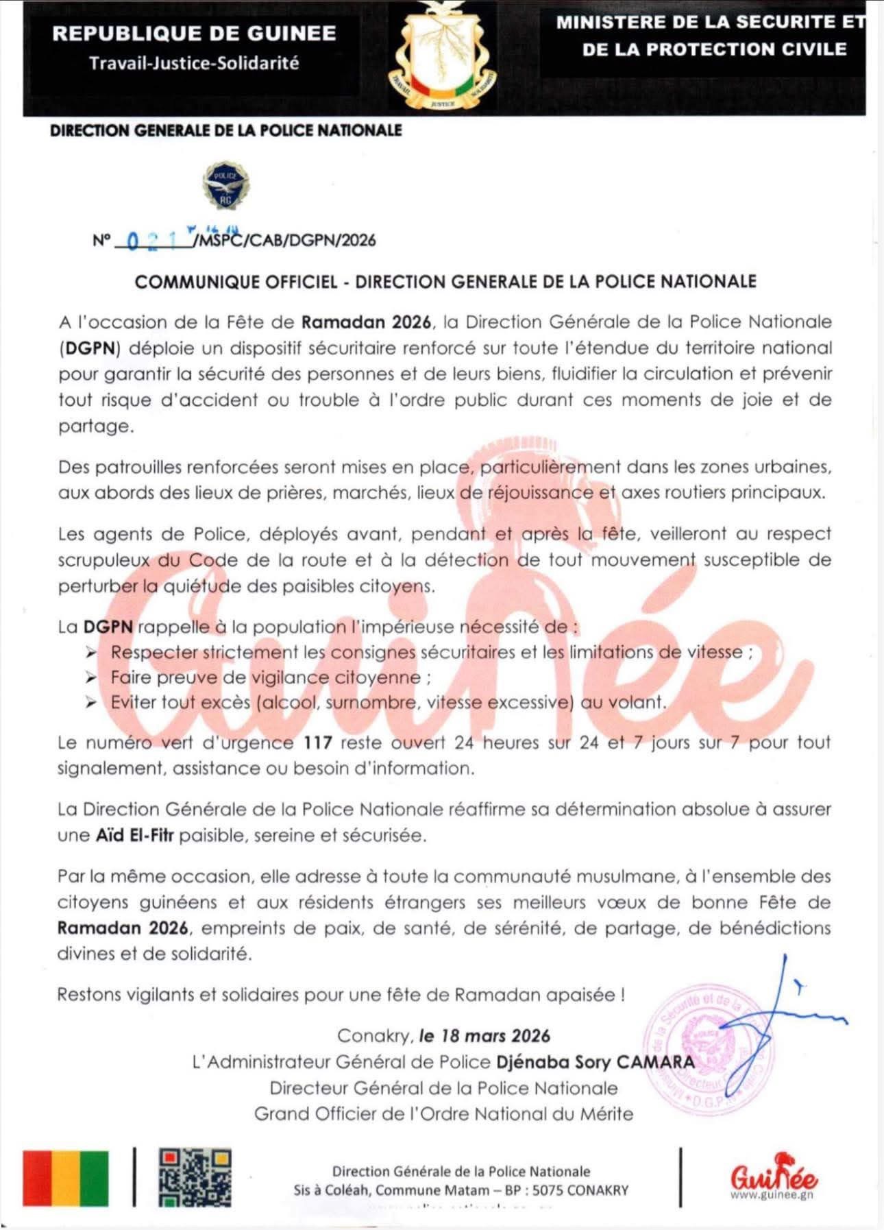 À l’approche de l’Aïd el-Fitr 2026, la Direction Générale de la Police Nationale (DGPN) annonce un important dispositif sécuritaire sur l’ensemble du territoire guinéen. L’objectif est de garantir une fête paisible et sécurisée pour tous les citoyens. Dans un communiqué signé par l’Administrateur Général de Police Djénaba Sory Camara, la DGPN précise que des patrouilles renforcées seront déployées avant, pendant et après la fête, notamment dans les lieux de prière, les marchés, les espaces de réjouissance et sur les principaux axes routiers.