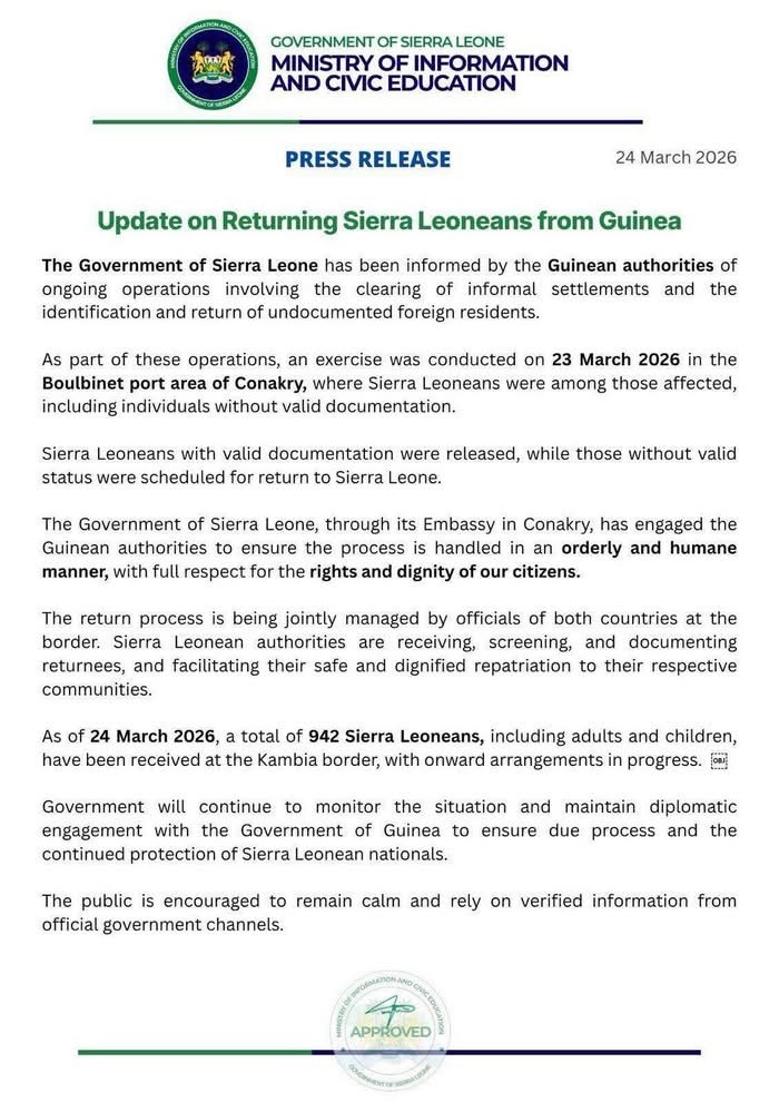 Communiqué de presse du Ministère de l’Information et de l’Éducation civique du Gouvernement de Sierra Leone ce 24 mars 2026