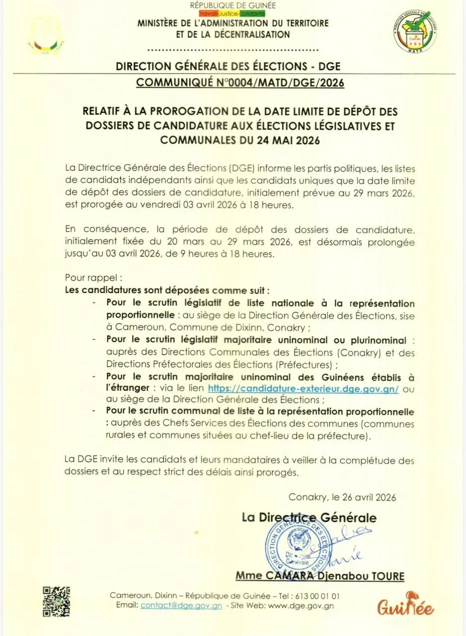 La Direction Générale des Élections (DGE) a décidé de prolonger le délai de dépôt des candidatures pour les élections législatives et communales.  Initialement fixée au 29 mars 2026, la date limite est désormais le vendredi 3 avril 2026 à 18 heures.  Cette décision concerne les partis politiques, les listes de candidats indépendants et les candidats uniques.