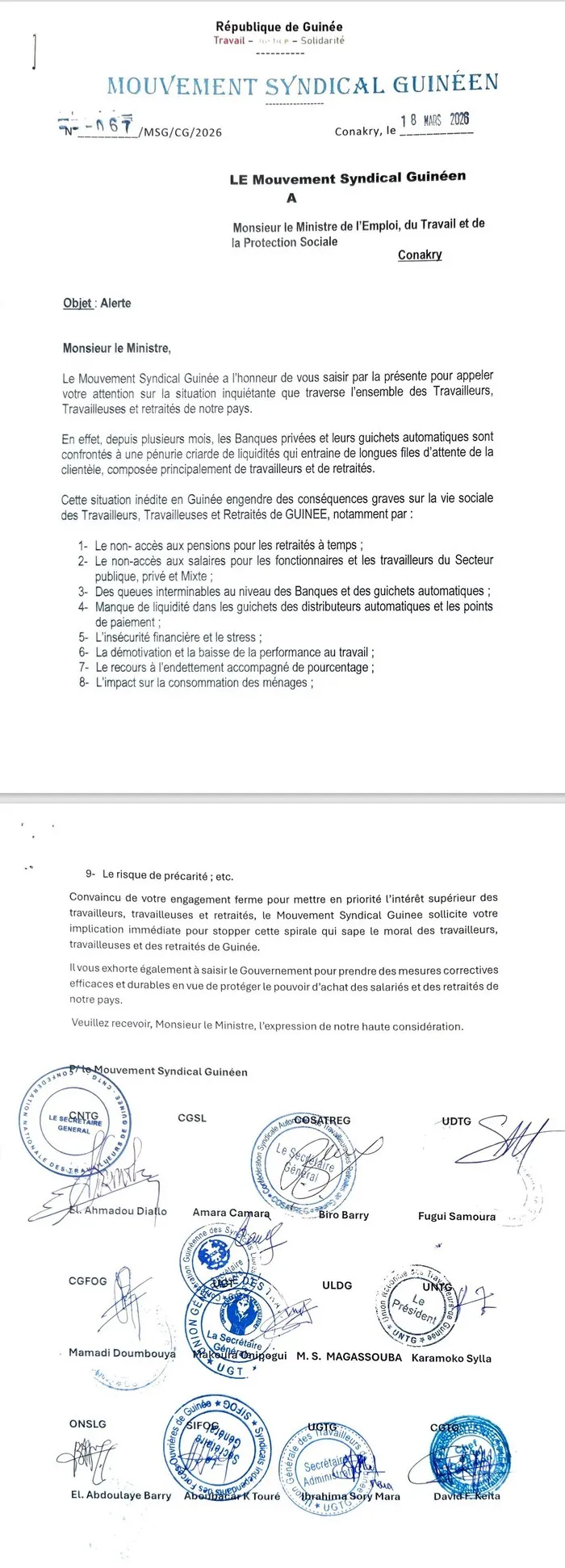 Face à la persistance de la crise du cash qui affecte les populations, le Mouvement syndical guinéen a interpellé le ministre de l’emploi, du travail et de la protection sociale par courrier.  Signée par treize structures syndicales, la lettre alerte sur les graves conséquences de cette situation pour la vie sociale des travailleurs, travailleuses et retraités de Guinée.