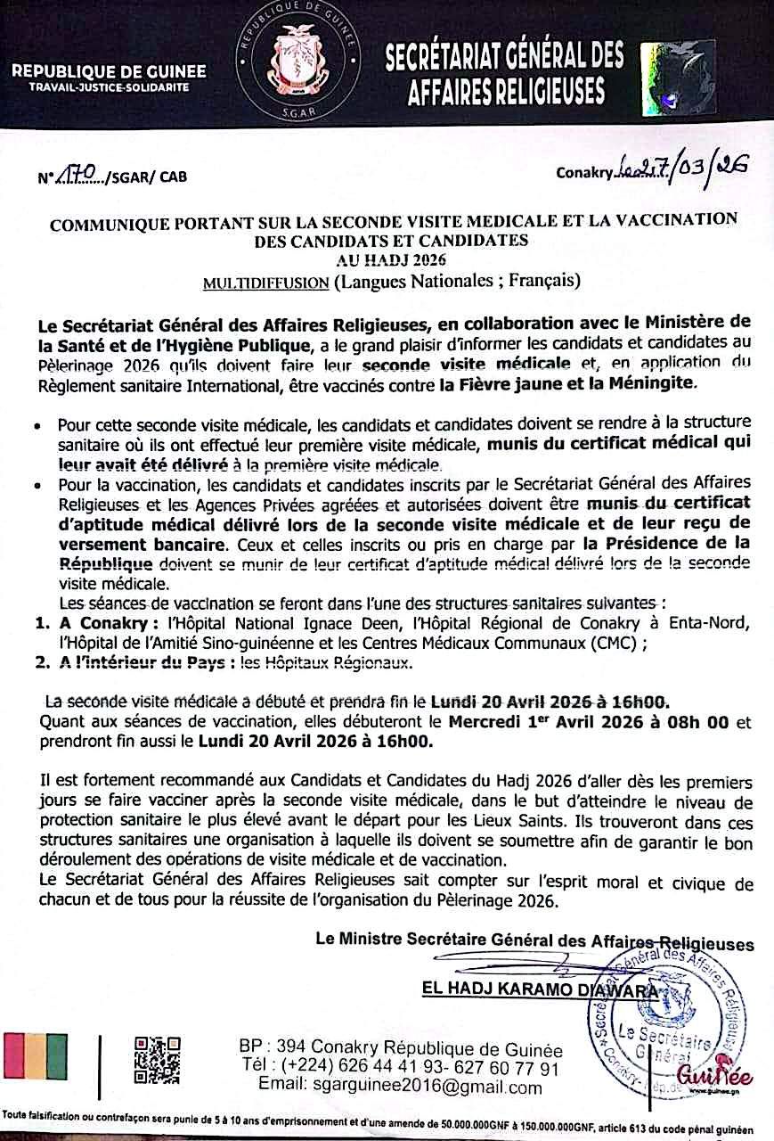 Le communiqué précise que la seconde visite médicale a débuté et se terminera le lundi 20 avril 2026 à 16 heures. Les séances de vaccination débuteront le 1er avril à 8 heures et se termineront le 20 avril 2026 à 16 heures.