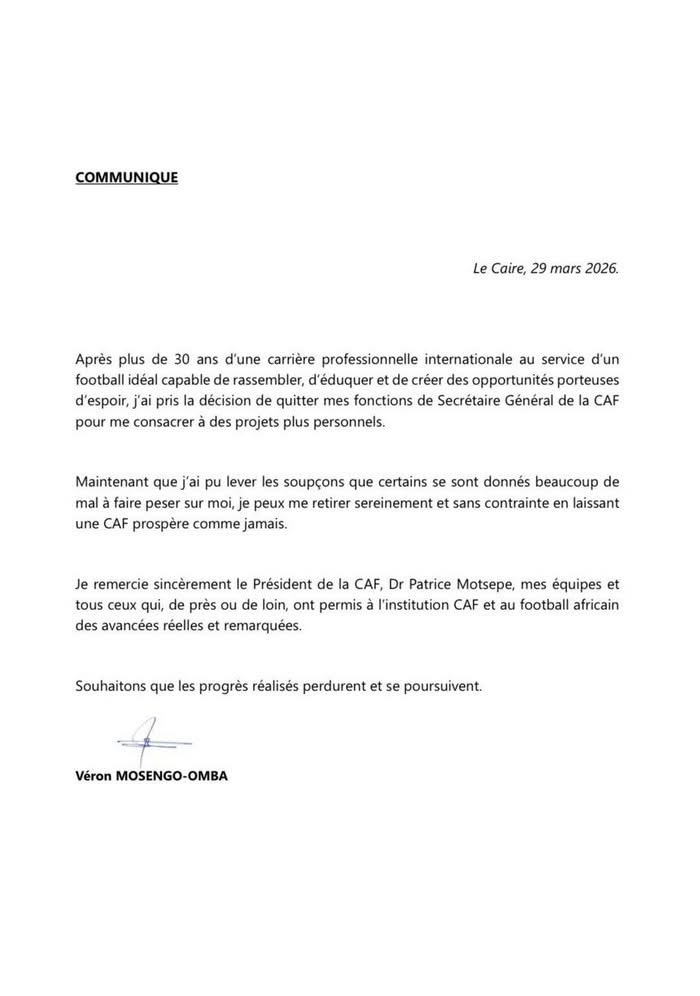 Véron Mosengo-Omba, Secrétaire général de la Confédération africaine de football (CAF), a annoncé sa démission ce dimanche 29 mars 2026.  Cette décision intervient alors que des soupçons pèsent sur lui.  Dans sa lettre de démission, il a indiqué qu’il allait désormais se consacrer à des projets personnels.