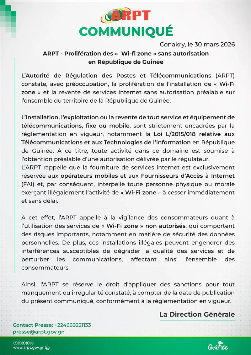 L’ARPT rappelle que l’installation, l’exploitation ou la revente de tout service ou équipement de télécommunications, fixe ou mobile, est strictement encadrée par la réglementation en vigueur, notamment la Loi L/2015/018 relative aux Télécommunications et aux Technologies de l’Information en République de Guinée. Toute activité dans ce domaine nécessite une autorisation préalable délivrée par le régulateur.