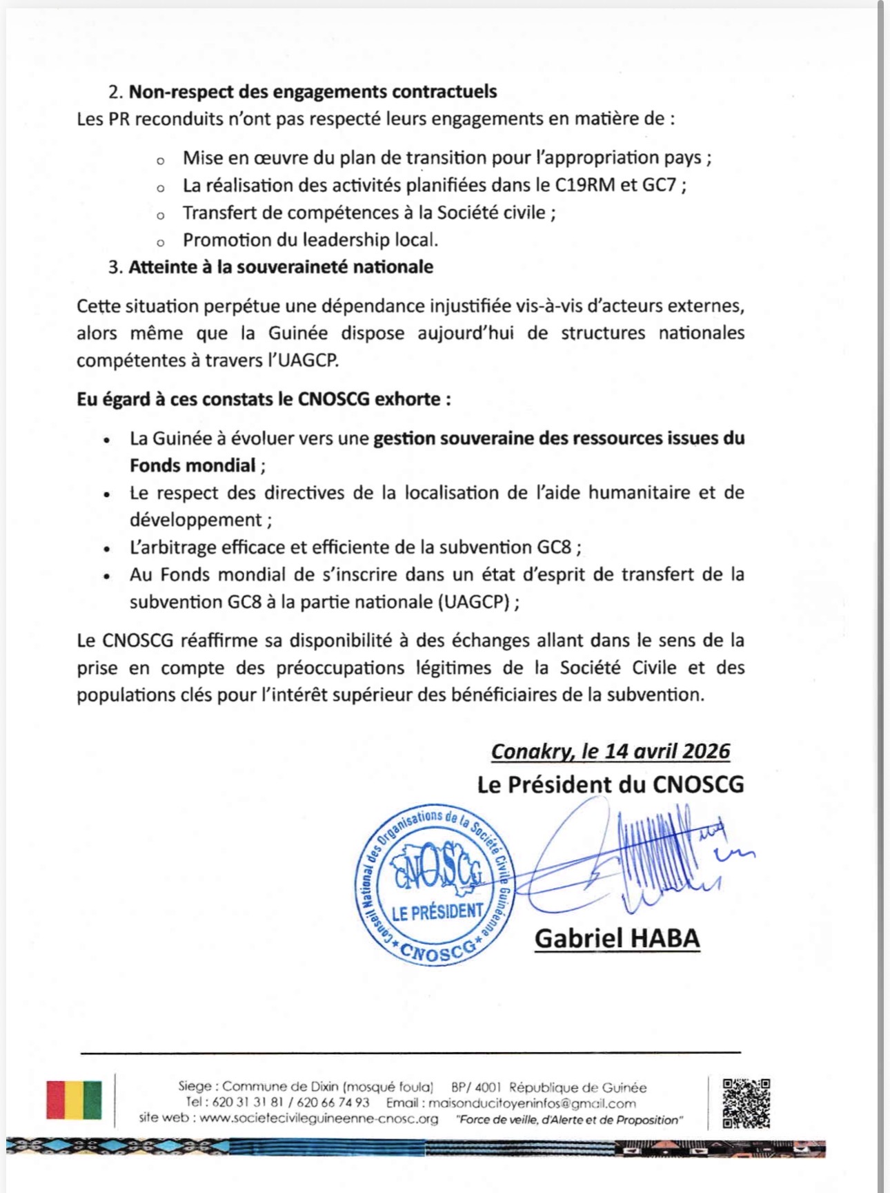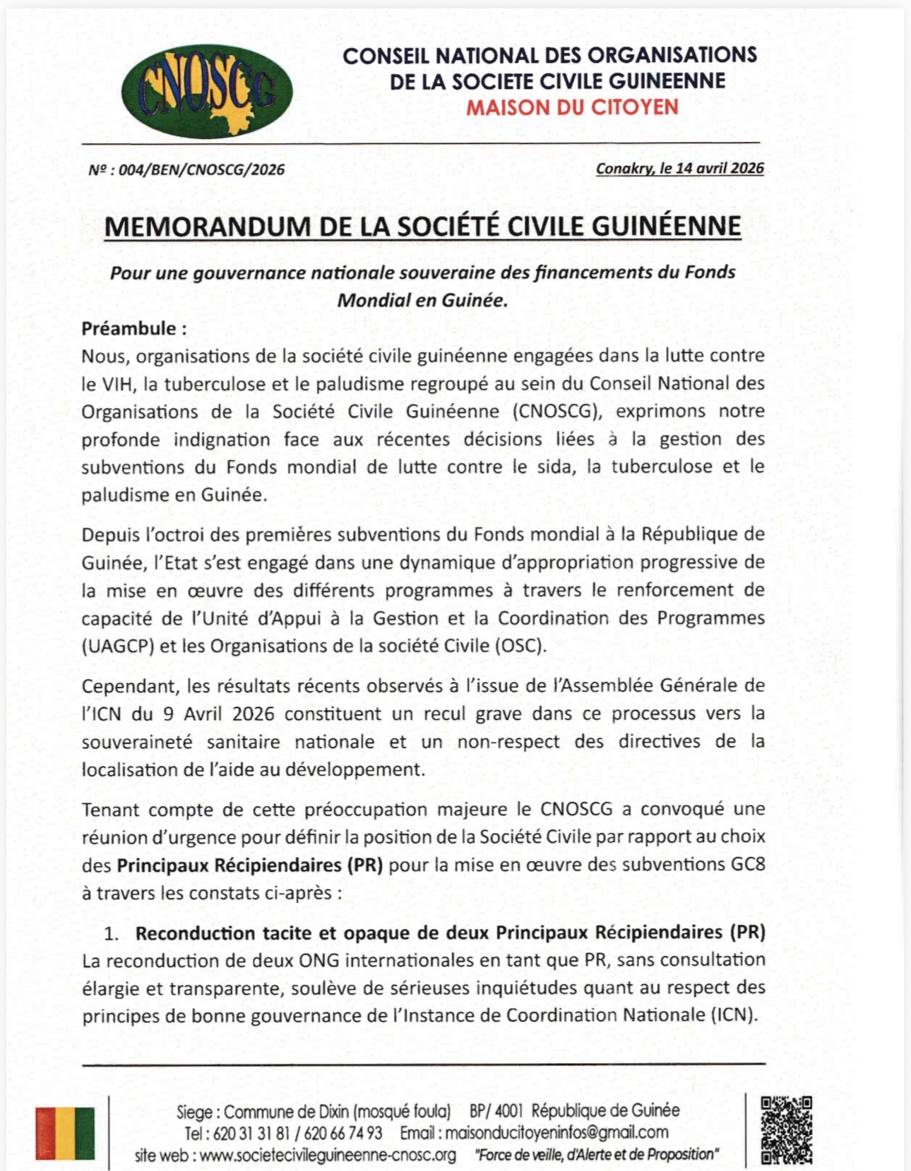 Le Conseil National des Organisations de la Société Civile Guinéenne (CNOSCG) a publié un mémorandum le mardi 14 avril 2026, exprimant son indignation face à l’utilisation des fonds alloués à la lutte contre le VIH, la tuberculose et le paludisme.  Face à cette situation, le CNOSCG a convoqué une réunion d’urgence pour définir sa position concernant le choix des récipiendaires.