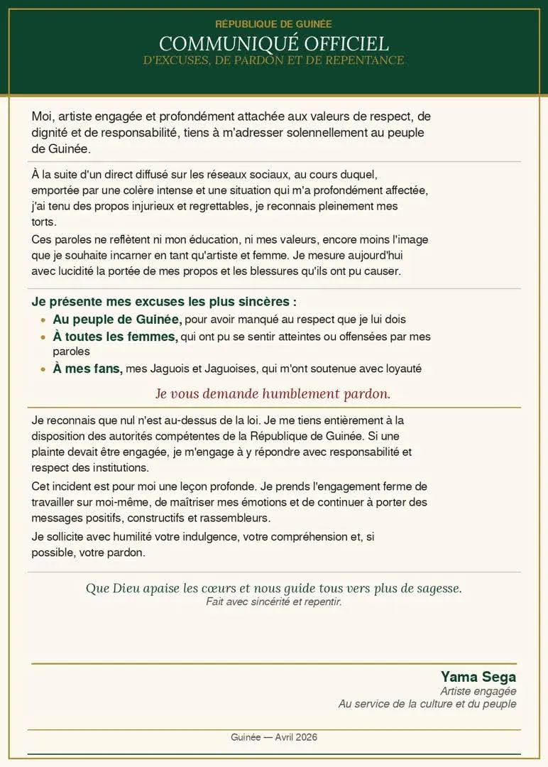 Suite à une vive controverse liée à des propos tenus dans des vidéos sur les réseaux sociaux, l’artiste guinéenne Yama Sega a publié un communiqué officiel d’excuses, de pardon et de repentance adressé au peuple de Guinée.