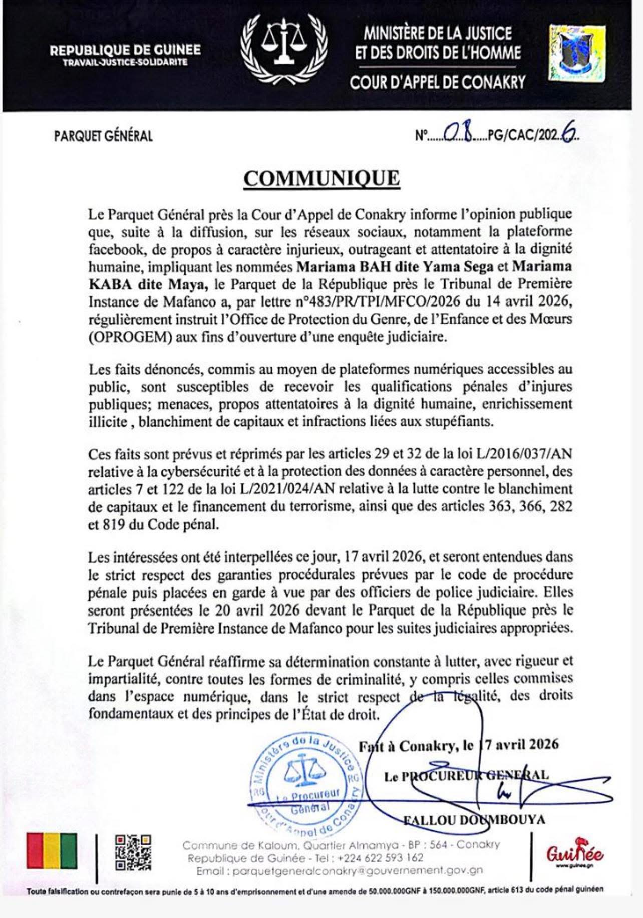 Yama Sega et Maya Lasolution, figure emblématique de la musique guinéenne et vlogueuse influente, respectivement, seront présentées devant le Tribunal de première instance (TPI) de Mafanco le 20 avril 2026.  Ce développement fait suite à leur récente audition par l’Office de la protection des droits et des garanties des enfants et des mères (OPROGEM), qui a conduit à leur placement en garde à vue ce vendredi après-midi. Le parquet de Conakry a annoncé dans un communiqué que les poursuites judiciaires appropriées seraient engagées contre les deux femmes.