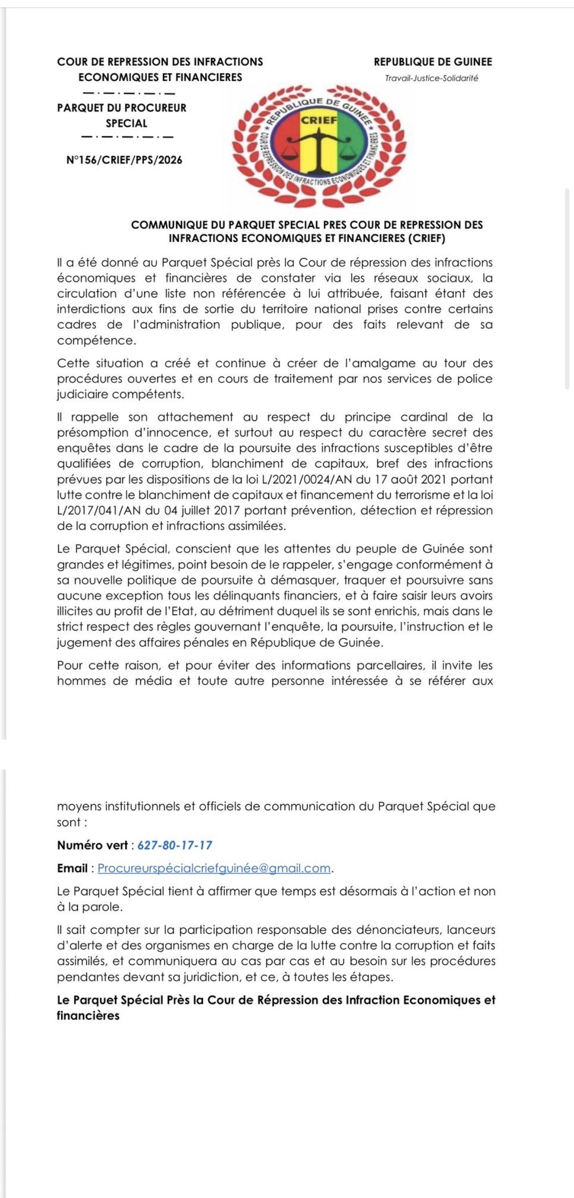 Le parquet spécial près la Cour de répression des infractions économiques et financières (CRIEF) a démenti catégoriquement la publication d’une liste « non référencée » interdisant à une centaine de cadres de l’administration publique guinéenne de quitter le territoire. Ce démenti vise à clarifier la confusion et les amalgames créés par la diffusion de cette information, notamment en ce qui concerne les procédures ouvertes et en cours de traitement par les services de police judiciaire compétents.