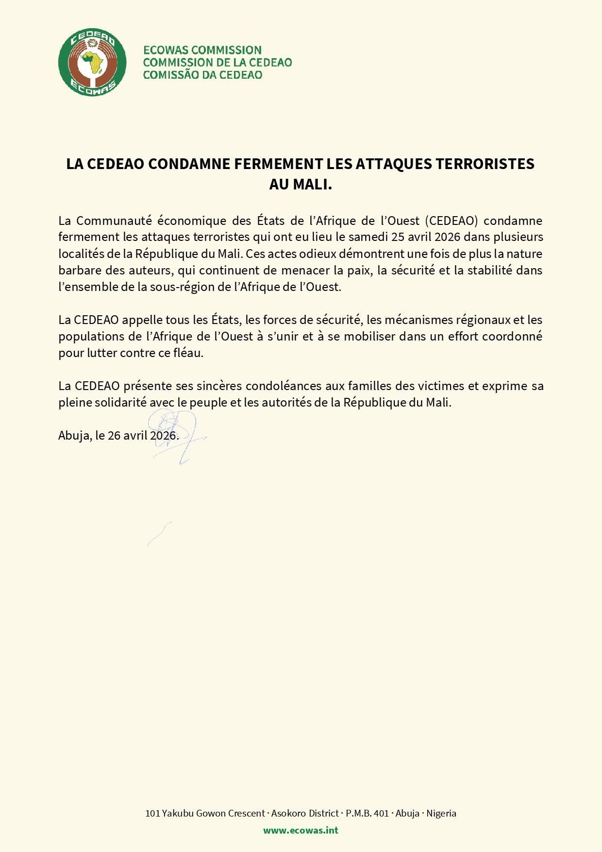 La Communauté économique des États de l’Afrique de l’Ouest (CEDEAO) a fermement condamné les attaques terroristes qui ont frappé plusieurs localités du Mali le 25 avril 2026. Dans un communiqué publié le 26 avril depuis Abuja, l’organisation sous-régionale a qualifié ces actes d’« odieux » et a souligné leur impact persistant sur la paix, la sécurité et la stabilité de l’Afrique de l’Ouest. La CEDEAO a exhorté les États membres, les forces de sécurité, les mécanismes régionaux et les populations d’Afrique de l’Ouest à renforcer leur coopération et à se mobiliser collectivement pour lutter contre le terrorisme. L’organisation a également présenté ses sincères condoléances aux familles des victimes et exprimé sa solidarité envers le peuple malien et ses autorités, réaffirmant son engagement en faveur de la stabilité et de la sécurité au Mali et dans la région.